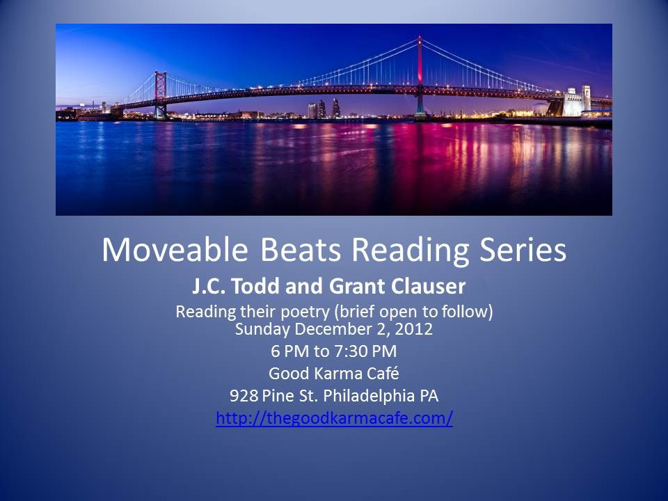 It’s late, and I’ve run out of ideas. Please add your own thoughts to this. If you want to hear me read, I’ll be at the Good Karma Cafe on Dec 2 with J.C. Todd.
